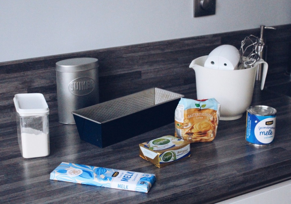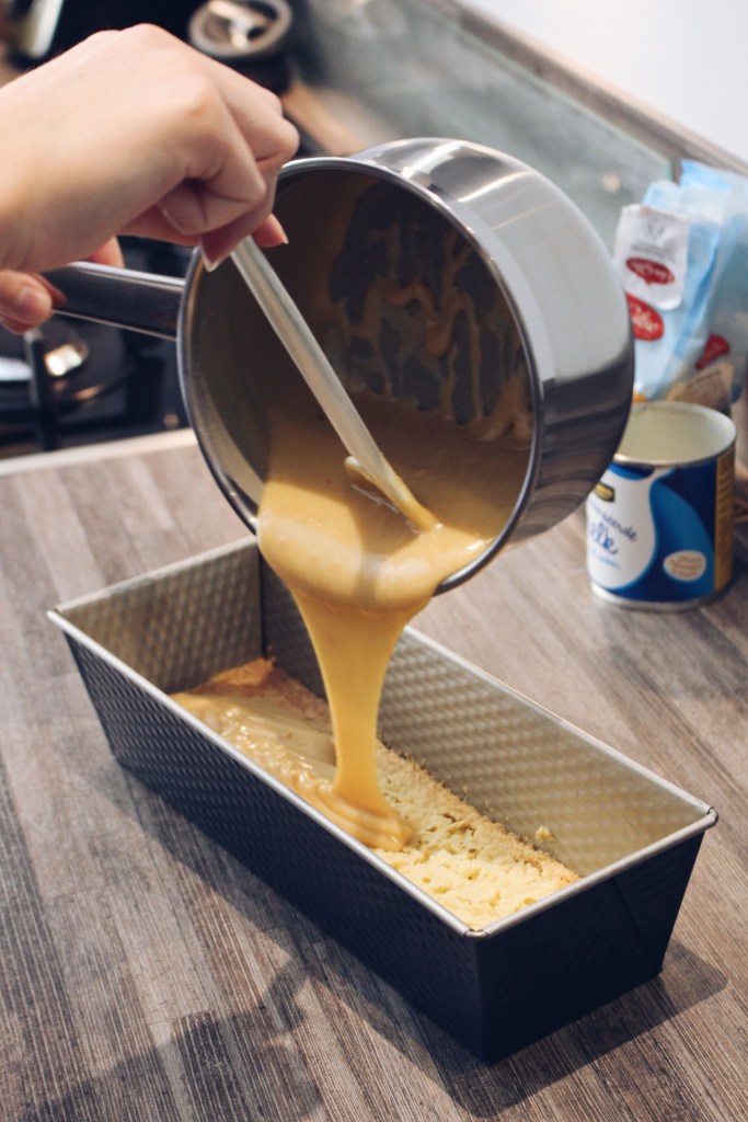 Doe de boter en basterdsuiker in een pan en laat smelten op laag vuur. Voeg daarna de gecondenseerde melk toe en breng langzaam aan de kook. Blijf 3 – 4 minuten roeren tot het mengsel een lichte karamelkleur heeft. Giet het mengsel over de koeklaag en strijk glad. Laat vervolgens ongeveer een uur in de koelkast opstijven.