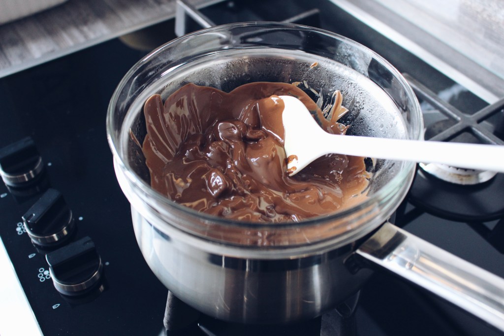 Smelt de chocolade au bain-mairie en strijk dit uit over de karamellaag. Laat het weer in de koelkast opstijven. Et voilà, je shortbread is klaar! Alleen nog even in stukken snijden. Ik haal er zelf meestal twaalf stukken uit.