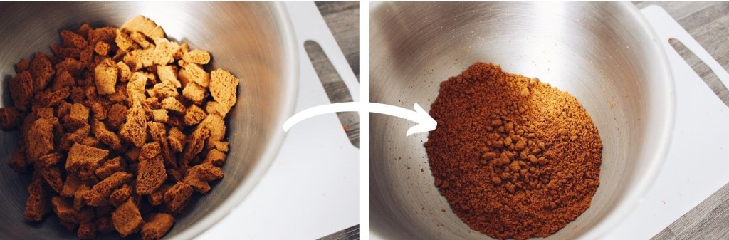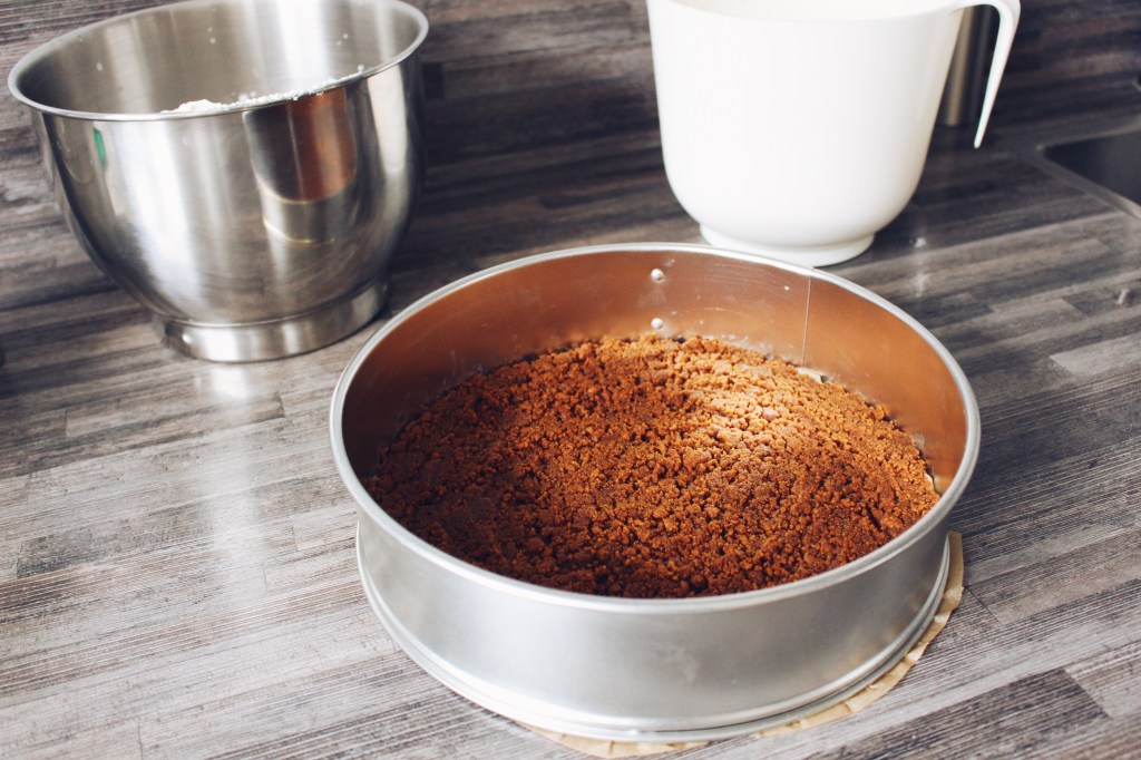 Maal de bastogne koeken fijn in een keukenmachine. Smelt de boter in een pannetje en voeg de fijngemalen bastogne hieraan toe. Roer het goed door en schep het in een met bakpapier beklede springvorm. Ik gebruikte een springvorm van Ø24 cm. Zet in de koelkast om af te laten koelen.