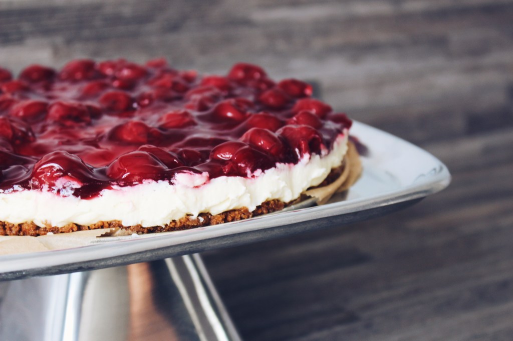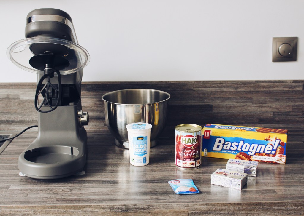Ik gebruikte het recept van Laura’s Bakery, maar heb de hoeveelheden van sommige ingrediënten aangepast. Zo gebruik ik één blik kersen vlaaifruit in plaats van twee, omdat ik de kersen van het vlaaifruit best zuur vind. Ook heb ik klop-fix toegevoegd om de slagroom te verstevigen.