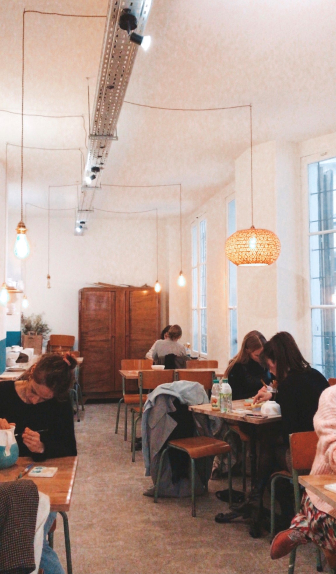 Daarna gingen we naar een atelier waar we keramiek konden beschilderen. Een heerlijke bezigheid waaraan we meteen een souvenirtje overhielden. Ik maakte zelf een kommetje met een techniek waarvoor je een tandenborstel gebruikt. Deze werd in het atelier uitgelegd en ik was echt weg van de voorbeelden die ik had zien staan, dus dit móest ik maken. Haha! Dit is mijn schaaltje voordat hij de oven in ging. De onderste helft heb ik roze geschilderd, maar dat zie je niet op de foto. Ik denk dat het een heel mooi schaaltje is geworden dat ik zeker vaak ga gebruiken en waardoor ik elke keer herinnerd wordt aan Parijs. Zo leuk! ’s Avonds aten we in een typisch Frans restaurant, genaamd Bouillon République. Een paar vriendinnen die de dag ervoor ook op het huisfeestje waren, gingen ook mee. Erg gezellig. Het restaurant is nog niet zo lang geopend, maar nu al ontzettend populair. Het zit in de wijk waar mijn vriendinnetje woont en zij en haar vriendinnen raadden het aan. Er worden betaalbare gerechten geserveerd en overheerlijke toetjes. Op aanraden van één van de Franse meiden nam ik de Franse uiensoep. Het ziet er misschien niet per se heel smakelijk uit op de foto, maar lekker was hij zeker.
