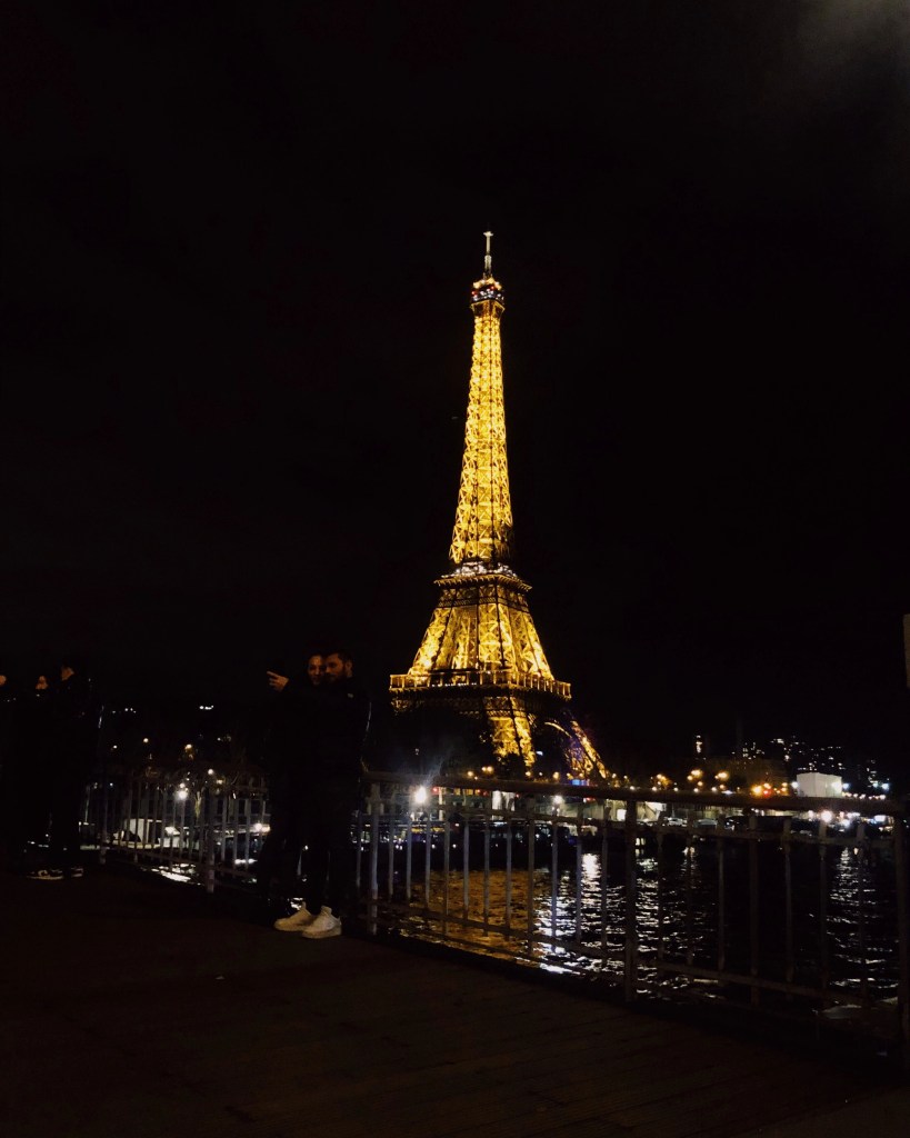 De Eiffeltoren bekijken is op zich al een must wanneer je in Parijs bent, maar de Eiffeltoren bekijken by night is er nog één voor op je lijstje! De Eiffeltoren is in principe de hele avond (als het donker is) verlicht, maar hét moment om de Eiffeltoren ’s avonds te bekijken is wanneer ‘ie gaat glinsteren. Dat gebeurt elk uur op het hele uur voor zo’n 5 minuten lang (van 20:00 tot 01:00 in de winter en tot 02:00 in de zomer). Zorg dat je van te voren een punt uitzoekt waar je de Eiffeltoren goed kan zien. Dat hadden wij niet gedaan, waardoor we de laatste minuten moesten rennen. 🤣 Lekker hectisch en hilarisch wel.