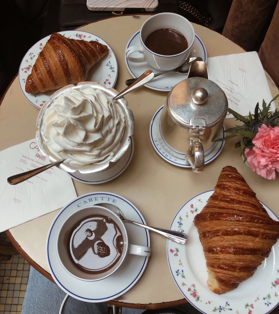 Oké, dan even over naar een iets kostbaardere foodspot. Carette is bekend van TikTok en erg Instagrammable. Ze zijn vooral bekend om de chocolademelk met slagroom en croissants. Die hebben we hier dan ook geprobeerd. Ik was een beetje huiverig, want normaal word ik altijd misselijk van chocolademelk en TikTok kon misschien te hoge verwachtingen scheppen. Maar ik kan je verzekeren: dit was echt zó lekker. Als ik er aan denk, loopt het water me alweer in de mond. We waren per persoon €16,00 kwijt, en omdat we er op een regenachtige dag kwamen, was het al helemaal de moeite waard. Doordat alles er zo goed uitzag en het zo goed smaakte, voelde het als een soort experience.