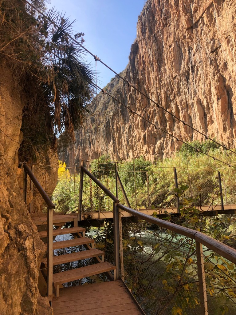 We volgden de Ruta de los Puentes Colgantes (vertaald: “de route van de hangbruggen”), startend bij de gelijknamige parkeerplaats Parking ruta Puentes Colgantes. Goed om te weten: wij dachten dat de bekende hotspot in Chulilla (charco azul, de steiger in het meer) op de route lag, maar dat was dus niet het geval. Aan het begin van de route hadden we er namelijk van bovenaf zicht op en zagen we mensen op de steiger lopen. Toen we andere wandelaars tegen kwamen, kwamen we er echter achter dat we daarvoor naar het dorp moesten en dat het vanuit het dorp zo’n 15 tot 20 minuten lopen was naar Charco Azul. Dat deden we daarom nog aan het eind van de dag.