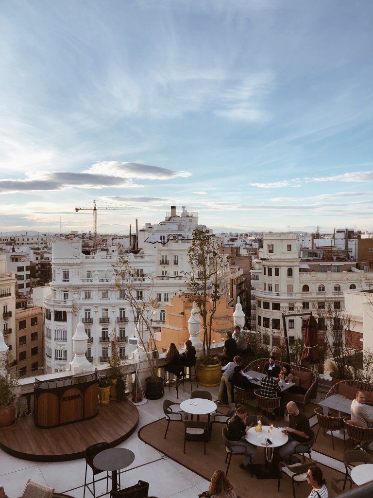 Super chille rooftop aan de rand van het oude stadscentrum. De rooftop hoort bij een hotel, maar je kunt bij de receptie gewoon aangeven dat je voor de rooftop komt en de lift naar boven nemen. Er staan kleine loungebanken en -stoelen en achterin zit een bar en zelfs een klein zwembad. Er hangt een relaxte sfeer en je kunt lekkere hapjes en drankjes bestellen, zoals patatas bravas en nachos met guacamole. Je hoeft geen toegang te betalen voor deze rooftop bar en het eten en drinken is normaal qua prijs (lees: €4,00 voor een wijntje).